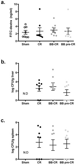 There was no difference in intestinal permeability measured by the FITC-dextran assay among the four groups on day 10 p.i. (Figure 4a). C. rodentium was quantifiable in the liver and spleen of infected but not control mice; though, B. bifidum treatment did not affect these counts (Figure 4b,c).