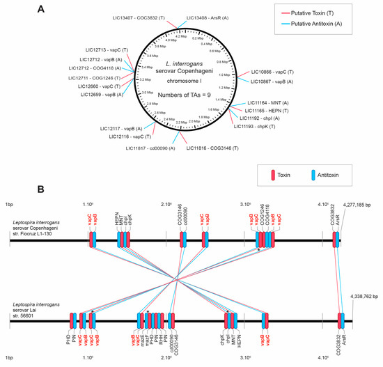 (A) Location map of toxin-antitoxin (TA) type II systems on the chromosome of L. interrogans serovar Copenhageni. (B) Comparison of the TAs sets of L. interrogans serovar Copenhageni and L. interrogans serovar Lai. In this schema, horizontal black lines represent the chromosomes of Copenhageni and Lai serovars. Red and blue lines indicate the amino acid sequence correspondence of toxins and antitoxins, respectively. Identity between linked toxins is greater than 90%. Toxins and antitoxins are identified by family or domains, as they appear in TAfinder. * denotes TA modules that were experimentally characterized and published.