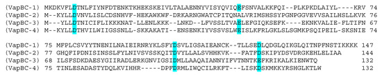 According to the search conducted on TAfinder, the L. interrogans serovar Copenhageni strain Fiocruz L1-130 has four vapBC loci, all on chromosome I, which encode four toxin-antitoxin modules of the VapBC family. Based on the numerical order of the genes in the chromosome, only VapBC-3 (LIC12660–12659) was experimentally characterized and thus considered a bona fide element [29], while the others remain to be elucidated. The alignment of the amino acid sequences of these four VapCs (Figure 2) shows the diversity between their primary sequences, but with conservation of the set of three or four acid residues responsible for coordinating Mg2+ or Mn2+ ions at the catalytic site. The cognate VapB antitoxins partners comprise different types of protein domains (RHH, AbrB, and PHD) and therefore cannot have their primary structures compared.