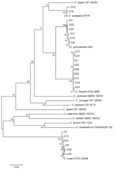 - Brenner, D.J.; O’Hara, C.M.; Grimont, P.A.D.; Janda, J.M.; Falsen, E.; Aldova, E.; Ageron, E.; Schindler, J.; Abbott, S.L.; Steigerwalt, A.G. Biochemical identification of Citrobacter species defined by DNA hybridization and description of Citrobacter gillenii sp. nov. (formerly Citrobacter Genomospecies 10) and Citrobacter murliniae sp. nov. (Formerly Citrobacter Genomospecies 11). J. Clin. Microbiol. 1999, 37, 2619–2624. [Google Scholar] [PubMed]