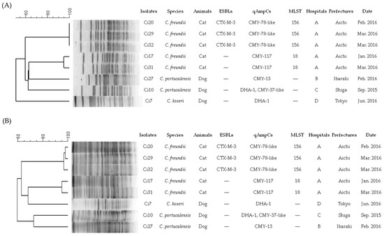 In the present study, we conducted MLST analysis for C. freundii isolates from animals for the first time. The three blaCTX-M-3-producing C. freundii strains (strains Ci20, Ci29, and Ci32) were assigned to ST156, which was the first ST identified in our study (Table 2). Additional analysis revealed a similar or identical antimicrobial susceptibility profiles and PFGE profiles of XbaI- and SfiI-digested genomic DNA among the three strains (Figure 2). In addition, the two CMY-117-bearing C. freundii strains (strains Ci17 and Ci31) were assigned to ST18, which was the previously identified ST in human-origin carbapenemase-producing C. freundii in Denmark [41], Spain [42], and Czech Republic [43], and had almost indistinguishable PFGE profiles. These ESC-resistant C. freundii strains were acquired from different animals in the same hospital, suggesting nosocomial infections. Similar findings have been observed in other ESBL-producing bacteria [28,33,38]. Therefore, infection control in hospitals is essential in preventing the dissemination of ESC-resistant Citrobacter spp. isolates among companion animals.