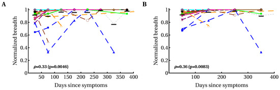 The breadth of the CD8 T-cell response, measured as the number of HIV-specific CD8 T-cell responses (or breadth of protein-specific (such as Gag-specific) CD8 T-cell responses) has been implicated in protection against disease progression [33,34,36,92]. Some, but not all, previous analyses suggested an increase in the breadth of HIV-specific CD8 T-cell responses over time [54,55,93,94]. We found variable patterns for the change in breadth over time, i.e., there were patients with increasing breadth (e.g., patients MM45, MM48, MM49), decreasing breadth (e.g., MM43, MM55), or with non-monotonically changing breadth (e.g., MM23, MM42; Figure S5). Because there was no significant change in the average number of T-cell responses in all patients (Figure S5), we calculated the dynamics of normalized breadth for individual patients, dividing the number of HIV-specific T-cell responses detected at a particular time point in a given patient by the total number of responses in that patient (Figure 3). Our analysis suggested that there was a moderate but statistically significant increase in the average normalized breadth over time (from 85% to 95%), and this increase was limited to the first 35 days after symptom onset.