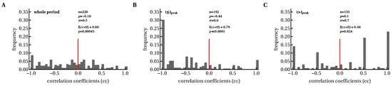 Expanding CD8 T-cell responses were negatively correlated with viral load before T-cell numbers reached their peak values. We calculated Spearman’s correlation coefficients between longitudinal changes in viral load and epitope-specific CD8 T-cell responses in each patient during the whole period (A), and before (B) and after (C) the peak of CD8 T-cell response. The value denotes the fraction of negative correlation coefficients (), and p values are indicated for the binomial test of equal distribution of positive and negative correlations.
