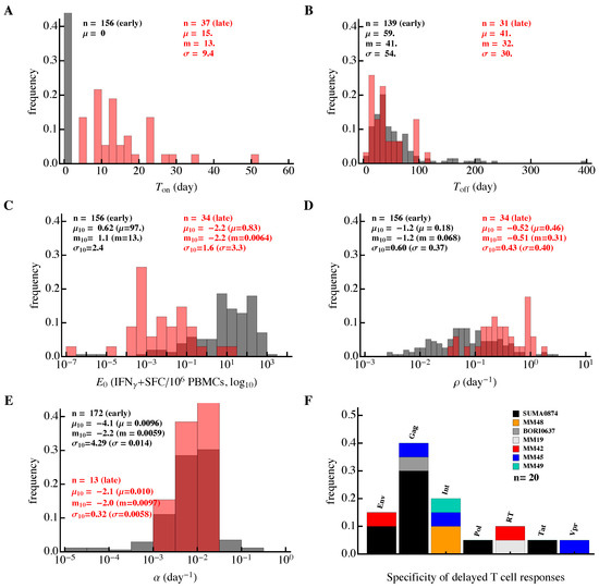 Differences in the kinetics of early and late HIV-specific CD8 T-cell responses. We fitted the model (Equation (1)) to the data on the dynamics of epitope-specific CD8 T-cell response in each patient and plotted the distribution of the estimated parameters. The results are presented separately for T cell responses that started expanding (or contracting) from the first observation (“early” responses, about 80% of all responses; black) or delayed responses, which were undetectable at one or several initial time points (“late” responses; red). Panels show distributions for (A) time of expansion of T-cell response (), (B) time to peak of each T-cell response (), (C) initial predicted frequency of epitope-specific CD8 T cells (), (D,E) expansion () and contraction () rates of T-cell responses, respectively, and (F) proteins recognized by late CD8 T-cell responses. In (A–E), n represents the number of fitted responses, and , m and represent mean, median and standard deviation, respectively (, , and are mean, median, and standard deviation for -scaled parameters). Late responses were predicted to have a higher expansion rate (Mann–Whitney, ) and smaller frequency (Mann–Whitney, ) than early responses.