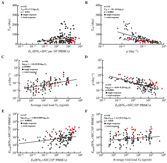 Both the average viral load and predicted frequency had minimal impact on the peak CD8 T-cell response (Figure 7E,F); interestingly, no correlation between CD8 T-cell precursor frequency and peak T-cell response was found in mice [106]. The length of the expansion phase () had little influence on the peak immune response. It is, therefore, possible that the peak immune response was determined by virus-independent factors (e.g., cytokines); further analyses are needed to better understand the mechanisms limiting the magnitude of T-cell responses to HIV.