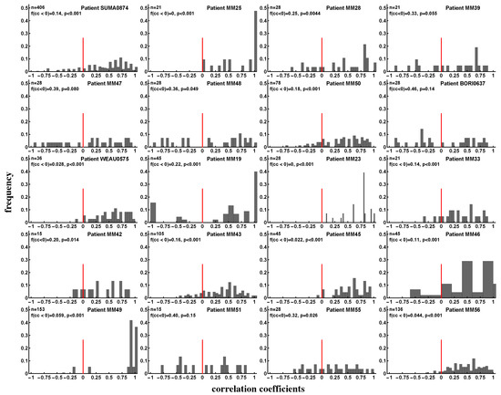 This previous study suffered from two major limitations: only a few CD8 T-cell responses were analyzed, and the analysis was restricted to a single time point [83]. Therefore, we sought to determine if there is any evidence for competition between T-cell responses specific to different viral epitopes in the data of Turnbull et al. [55]. If there is competition between two responses, we expect that an increase in the magnitude of one response should lead to a decline in the magnitude of another, i.e., there should be a negative correlation between longitudinal changes in magnitudes of the two responses (Figure S14). We therefore calculated correlations between magnitudes of all pairs of epitope-specific CD8 T-cell responses over time for every patient (Figure 8). The proportion of negative correlations indicating potentially competing immune responses varied by patient and was not strongly dependent on the time since infection (e.g., see Figure S15). In some patients, the proportion of positively and negatively correlated responses were similar (e.g., MM39, MM47, MM51) but in most patients, negative correlations were significantly under-represented as judged by the binomial test (Figure 8). Overall, approximately 18% of correlation coefficients were negative, suggesting that a small proportion of T-cell responses may be competing during the infection. However, in contrast with the assumptions of many mathematical models, the vast majority of responses do not appear to compete during the infection.