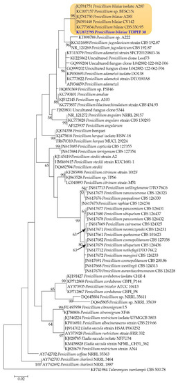 Phylogenetic tree based on 18S rRNA sequence highlighting the phylogenetic position of Penicillium bilaiae TDPEF30 within closely related Penicillium spp. Talaromyces veerkampii (CBS 500.78, KF741984) was used as an outgroup. Bootstrap values are expressed as percentage of 1000 replicates.