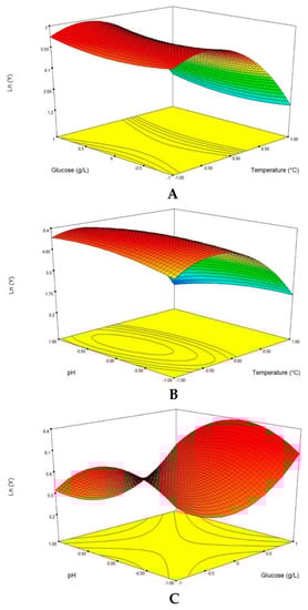 A response surface design was further applied when the optimal region for running the process has been identified [27,28,30]. Based on the Placket-Burman design output, an RSM using the Box Behnken design was applied to determine the optimal levels of the three selected variables (temperature, glucose and initial pH). The respective low and high levels with the coded levels for the three variables are defined in Table 3. A total of 15 experiments with different combinations of the selected parameters were performed. The observed and predicted responses are reported in Table 4. The experimental results were analyzed by standard ANOVA and the BBD was fitted with the second-order polynomial equation: