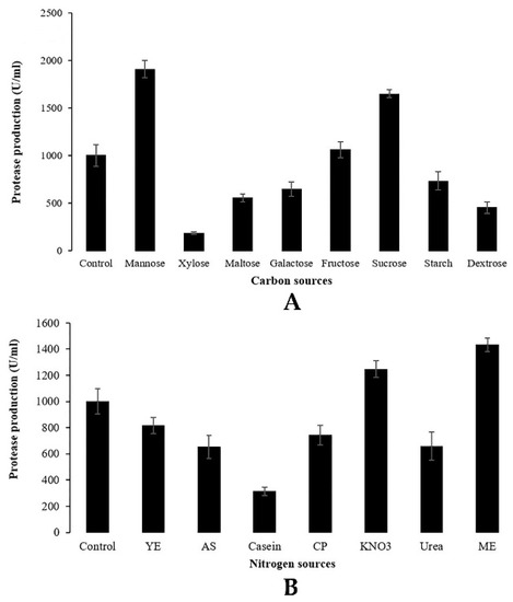 Both organic and inorganic sources of nitrogen (yeast extract, ammonium sulfate, casein, casein peptone, KNO3, urea, malt extract) were added separately to the culture medium to evaluate their influence on protease production. Results reported in Figure 3B clearly indicate that the highest level of protease production was obtained with malt extract (1433.28 U/mL) followed by KNO3 (1247.07 U/mL). Among the various sources of carbon and nitrogen tested, mannose and malt extract were found to be the most suitable substrates for the protease production from the endophytic fungus Penicillium bilaiae TDPEF30.