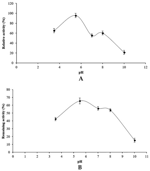 The effect of pH on protease activity was determined over a pH range of 3–9 using different buffer solutions. As shown in Figure 4A, maximum protease activity was observed at pH 6, which indicated the acidity of the proteolytic enzyme produced by the endophytic fungus associated with adult date palm trees. The proteolytic enzyme was active at pH 8 since the relative activity at pH 8 was about 50% of that observed at pH 6. Proteases were totally inactivated at pH 9 and 10.