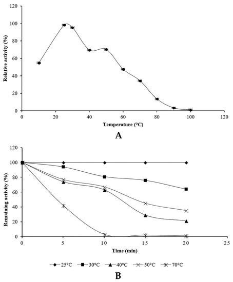 Proteolytic enzyme activity of the endophytic fungus Penicillium bilaiae TDPEF30 was measured at temperatures ranging from 10 to 100 °C. The relative and the residual activities were determined (Figure 5). The proteolytic activity showed that the enzyme maintained more than 50% of its activity over a range of 20–50 °C with optimum activity at 25 °C using casein as a substrate (Figure 5A).