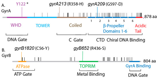 Conservation of protein sequences in E. coli and Salmonella gyrase and location of functional domains. (A) The GyrA protein is shown with the purple WHD domain, which contains the catalytic tyrosine (Y122*), the blue Tower domain, the brown coiled-coil domain that forms the C-gate, and the blue C-Terminal domain containing six pinwheel elements that fold into a spherical DNA binding surface. The red C-terminal acidic tail has many differences including the length of 38 residues in Salmonella compared to 35 in E. coli. (B) GyrB encodes the yellow ATPase domain that forms the ATP-gate, the green topoisomerase-primase (TOPRIM) domain that coordinates Mg++ binding, and a C-terminal GyrA interaction domain. Positions in GyrA and GyrB that encode different amino acids are shown as black hatches along the Salmonella map.