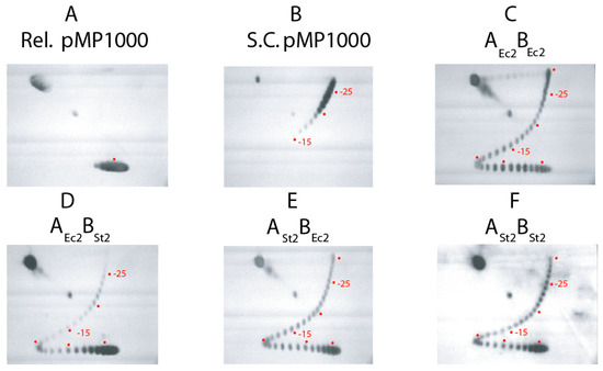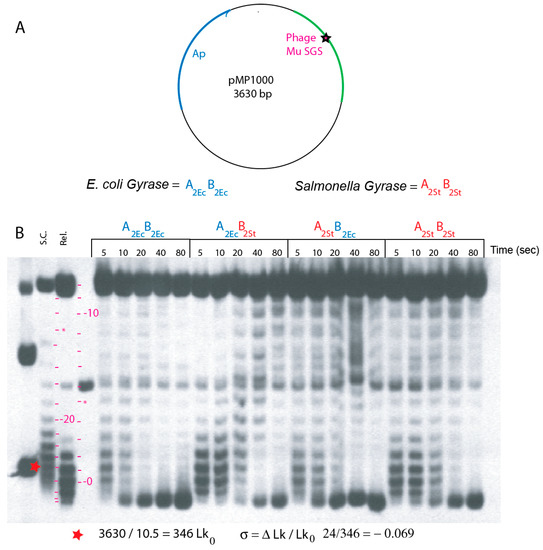 Supercoil characteristics of WT E. coli and WT Salmonella gyrase (A2Ec-B2Ec and A2ST-B2ST) were also compared with transgenic isoforms A2Ec-B2ST and A2ST-B2Ec (Figure 2). Reactions (100 µL) assembled on ice in G-buffer with 230 fmol of relaxed pMP1000 were incubated at 30 °C for 30 min to form stable gyrase-DNA complexes [28]. ATP was stirred into each reaction at 1.2 mM, and 10 µL aliquots were withdrawn and stopped by addition of SDS at 5 s, 10 s, 20 s, 40 s, and 80 s time points. Samples loaded onto an agarose gel with 0.5× TBE and 0.48 µM chloroquine phosphate were subjected to electrophoresis at 47 V for 20 h. DNA bands representing single topoisomers were visualized from DNA Southern blots.