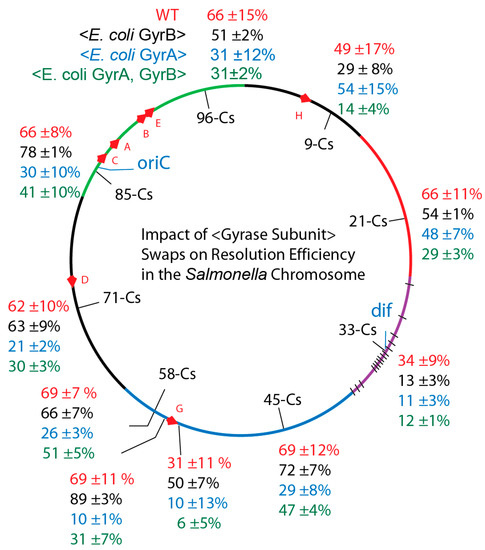 In vivo resolution assays of Salmonellae with precise chromosomal swaps of E. coli GyrA and GyrB subunits exploited supercoil reporters in six chromosome macrodomains. Macrodomain in Salmonella genome segments correspond to the six macrodomains of the E. coli chromosome: Ori-green; Right; Unstructured - black; Right, red; Ter, purple with black hatches showing matS sites; Left Domain, blue; Left unstructured domain, black. Resolution efficiencies at 10 positions are shown for: Salmonella WT, red; Strains with the E. coli GyrB transgene, black; Strains with E. coli GyrA, blue; and Salmonella with E. coli GyrA + GyrB, green.