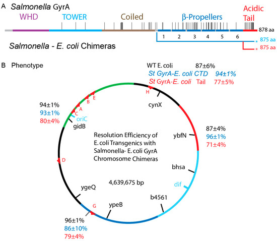 The C-terminal DNA binding domain of E. coli GyrA induces supercoiling losses in the Salmonella chromosome. (A) The genetic map of the different gyrase species tested is shown at the top (B) In vivo resolution results are compared for WT Salmonella gyrase―red numbers; strains with an E. coli gyrA replacing the Salmonella allele―black numbers; and two chimeras containing the N-terminal E. coli GyrA fused to Salmonella β-propeller elements at two points marked by blue and purple lines beneath the map.