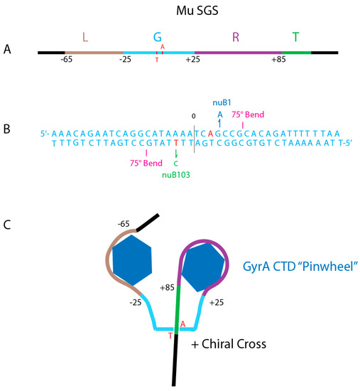 Anatomy of the Mu SGS. (A) Map of the 150 bp Mu SGS. Four regions include the left arm (Brown L), the Gate segment (Aqua G), the right arm (Purple R) and Transfer segment (Green T). Numbers show bp positions to the left (−) or to the right (+) of the center DNA cleavage. (B) The Gate DNA nucleotide sequence shows important positions for catalytic supercoiling. GyrA Tyr-122 makes a transient covalent bond with +3 A on the top strand and with −3 T on the bottom strand (red). Mutations that enhance supercoiling processivity include the +3 G-A transition (Blue nuB1) on top, and the nuB103 −3 T to C transition (Green) on the bottom strand. Two 75° bends occur at positions +7G, +8C on top and at −7G, −8G on the bottom strand [74]. (C) Two CTD pinwheel elements of a GyrA dimer interact with L and R arms to make a (+1) loop that places the T segment in position to pass through an open gate during a sign inversion strand transfer [75].