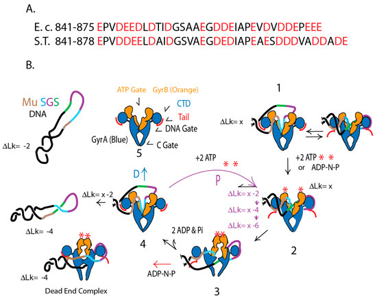 The Berger lab showed that the acidic amino acid rich C-terminal tail of E. coli GyrA is responsible for different catalytic rates and enzymatic endpoints in comparative studies of the distantly related M. tuberculosis gyrase. Competition between the tail and DNA for binding to the CTD β-propellers (Figure 5A) [42,43] explains why the purified E. coli GyrA dimers do not bind DNA [33]. The E. coli GyrA tail has 14 substitutions and is three residues shorter than Salmonella GyrA tail (Figure 5A); these differences could explain why GyrAEc is a more processive enzyme than GyrAST.