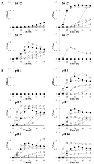 Growth of six plant growth-promoting bacteria under different temperatures (A) and pH values (B). Growth was monitored at OD660 using a biophotorecorder. Data are the means of three replicates. Symbols:
