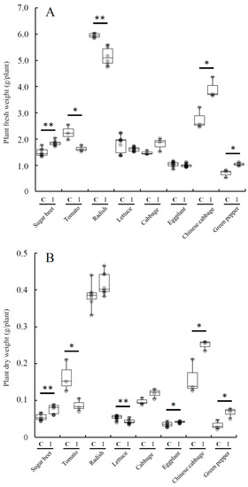 PotAce N potting soil (Katakura & Co-op Agri, Tokyo, Japan) was used to assess the plant growth. Vegetable seeds [cabbage (Brassica oleracea L. cv. Harunami), lettuce (Lactuca sativa L. cv. Cisco), tomato (Solanum lycopersicum L. cv. Momotaro), radish (Raphanus raphanistrum L. cv. Taibyo sobutori), eggplant (Solanum melongena L. cv. Senryo no.2), Chinese cabbage (Brassica rapa L. cv. Kigokoro 85, Kigokoro 65, Haregi 85, and Okiniiri), and green pepper (Capsicum annuum L. cv. Kyomidori, Kyonami, Ace, and Pitaro)] were purchased from Takii Seeds Co., Ltd. (Kyoto, Japan). Sugar beet seeds (Beta vulgaris L. cv. Rycka) were used as a reference and were provided by the Hokkaido Agricultural Research Center, National Agriculture and Food Research Organization, Hokkaido, Japan.