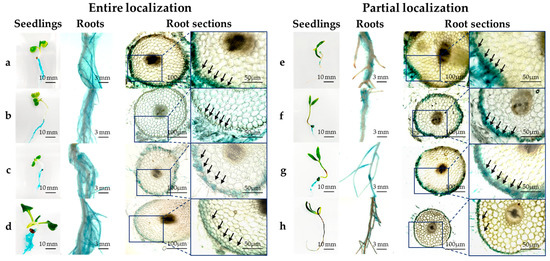 Tissue localization of Variovorax sp. HRRK170 in seven vegetable seedlings and sugar beet as a reference. The cells localized in the seedlings at 7 days post-inoculation were detected using GUS staining, and entire (left panels) and partial (right panels) localization was observed using a stereomicroscope. (a) Chinese cabbage (cv. Haregi 85), (b) cabbage (cv. Harunami), (c) lettuce (cv. Cisco), (d) radish (cv. Taibyo sobutori), (e) green pepper (cv. Kyonami), (f) eggplant (cv. Senryo 2 go), (g) tomato (cv. Momotaro), and (h) sugar beet (cv. Rycka) as a reference. Boxes show the enlarged regions in insets, and arrows indicate the localization of HRRK 170 cells. Photos of seedlings, roots, and root sections were obtained using a digital camera, stereomicroscope, and inverted microscope, respectively.