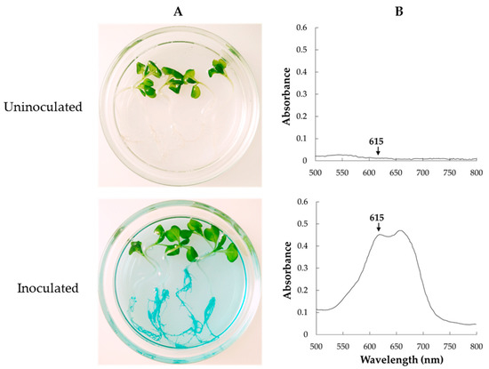 Color development in the reaction solution of GUS-stained Variovorax sp. HRRK 170 localized in the roots (Chinese cabbage, cv. Haregi 85) (A) and an absorption wavelength of the color-developed reaction solution (B). The absorbance of indigo-blue chromophore produced by the enzymatic hydrolysis of β-glucuronidase (OD615) is shown by the arrows.
