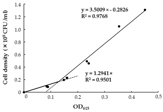 To subject the staining intensity to colorimetry, the most appropriate wavelength in absorption spectra was first obtained from the color-developed solution caused by GUS-stained HRRK170 cells, i.e., absorbance at 615 nm was used as an index of staining intensity (Figure 5B). Then, the correlation between the cell density of HRRK170 (cell number per mL) and OD615 was assessed (Figure 6). Interestingly, the result indicated that OD615 was linearly correlated with the cell density obtained from plate dilution method, although absorbance data below or above 0.128 were fitted to different correlation coefficients in order to achieve better linearity (Figure 6). The cell densities were then estimated using OD615 with this correlation curve.