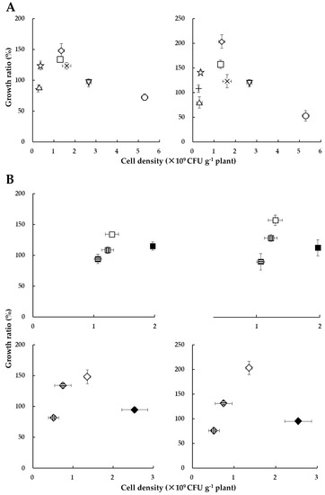 Figure 7A shows the relationship between cell density of HRRK170 (cell number per g of plant) and the plant growth ratio (percent of the inoculated plant weights against uninoculated control, which was calculated from the plant weights obtained in Figure 3) for seven vegetables with sugar beet as a reference. Results indicated that the plant growth ratio (%) was closely related to the cell density and had its optimum values for the plant growth promotion, i.e., green pepper and Chinese cabbage exhibited higher values of both growth ratio and cell density than radish and lettuce, and their growth ratios were significantly higher than those of the other five vegetables (Figure 3 and Figure 7A). Interestingly, the cell densities of cabbage, eggplant, and tomato were higher, while their growth ratios were lower than those of green pepper and Chinese cabbage. Notably, the growth ratio of tomato was considerably reduced, although it was infected with the highest number of cells.