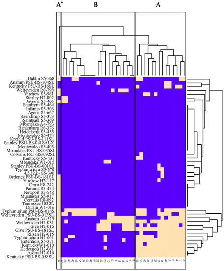 Heatmap representation of lysis profiles of 36 Salmonella phages tested (vertical axis) on 47 Salmonella host strains (horizontal axis) from Thailand and USA Phages were classified into three groups, including (A) broad, (B) narrow and (A*) special broad host range. Beige areas indicate lysis and darker areas indicate no lysis.