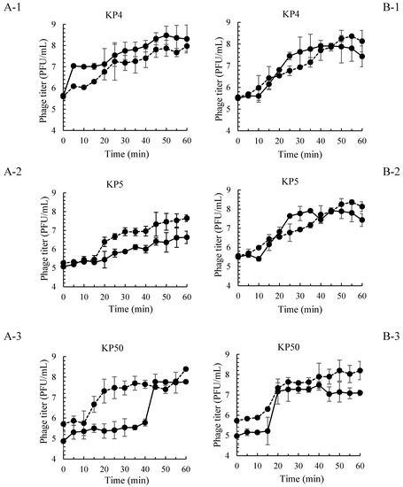 One-step growth curve of phage KP4, KP5 and KP50 on S. Enteritidis (A-1, A-2 and A-3) and S. Typhimurium (B-1, B-2 and B-3). MOI 100 presented by