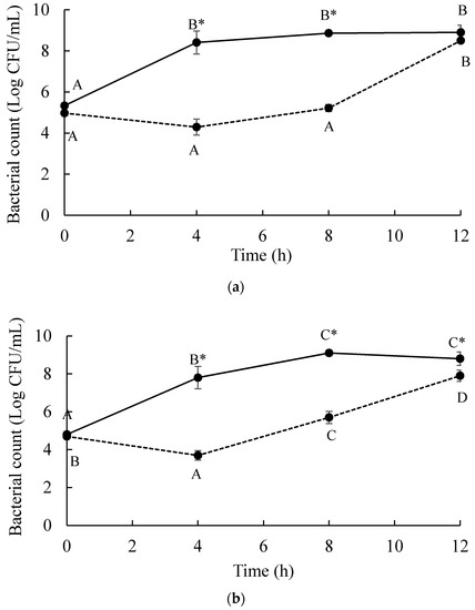 An overnight culture of S. Enteritidis and S. Typhimurium prepared as mentioned above (10 mL) was separately centrifuged at 6000× g for 10 min at 4 °C. To wash cell pellets, 5 mL of PBS were added and centrifuged at the same conditions three times. Washed Salmonella pellets were suspended in TSB and diluted to approximately 105 CFU/mL. Phage cocktail stock was diluted with TSB to achieve phage concentration at 107 PFU/mL. Each Salmonella strain suspension and phage cocktail preparation were mixed at a ratio of 1:1 by volume and incubated at 37 °C in a shaking incubator (ThermoStableTM IS-30 model, DAIHAN Scientific, Gangwon-do, Korea) at 220 rpm for 12 h. Controls included in the study were only S. Enteritidis and S. Typhimurium cultured in TSB. The cell numbers of S. Enteritidis and S. Typhimurium from the treatments and controls at each temperature tested were enumerated every 4 h interval by a spread plate on TSA. After 12 h of experiment, samples were collected for the analyses of phage resistance.