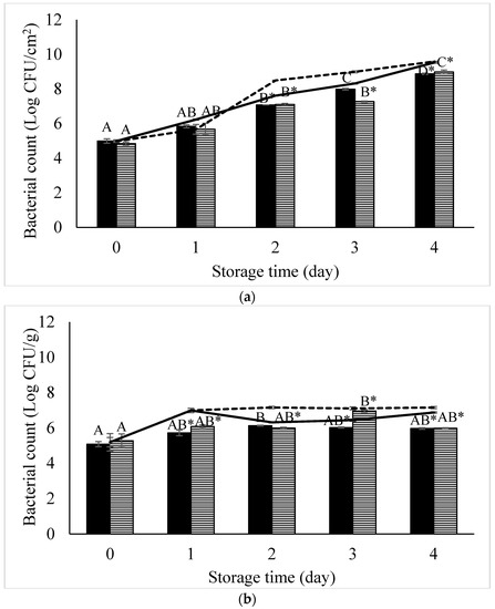 . Bars represent the mean standard deviation (n = 3). The sign (*) on the lines indicates significant differences (p < 0.05) of bacterial count between control and treatment during storage time for a given Salmonella strain. Different uppercase letters on the lines indicate significant differences (p < 0.05) of bacterial count among days of storage for a given Salmonella strain.