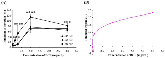 To investigate whether BCE has more of an effect on rotavirus itself, BCE was treated with the Wa virus before the MA104 cells were infected. Results showed that under 3 mg/mL of BCE the inhibition effect was dependent on dose and incubation time (Figure 1A). The rotavirus infection of the host cells is generally known to be enhanced by the action of host trypsin on rotavirus [12]; thus, in this study, colorimetric trypsin inhibitor assay was performed and BCE showed dose dependent trypsin inhibitory efficacy (Figure 1B).