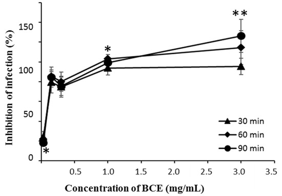 The effects of BCE on the rotavirus infection in MA104 cells according to time and dose. The BCE was pretreated to MA104 cells for 30, 60, and 90 min before rotavirus infection. The infected MA104 cells were incubated at 37 °C for 5 days. The single and double asterisk indicate significant difference of the inhibitory effect of infection of BCE among different time points (* p < 0.05, ** p < 0.01). Data are expressed as the mean ± SD (n = 8).