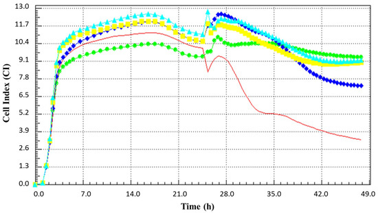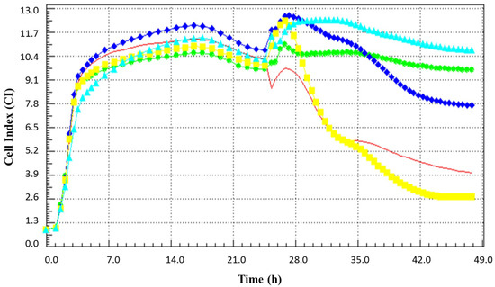 - Atienza, J.M.; Yu, N.; Kirstein, S.L.; Xi, B.; Wang, X.; Xu, X.; Abassi, Y.A. Dynamic and label-free cell-based assays using the real-time cell electronic sensing system. Assay. Drug Dev. Technol. 2006, 4, 597–607. [Google Scholar] [CrossRef] [PubMed]
