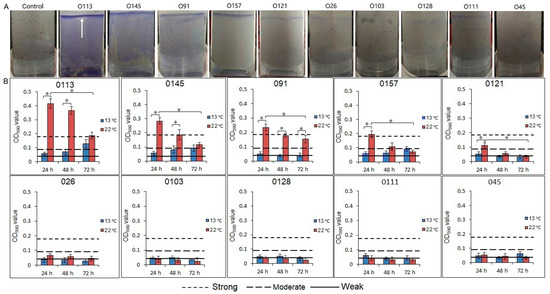 Biofilm formation of 10 STEC strains on a stainless steel surface. (A) Biofilms of 10 STEC strains were stained by crystal violet after incubation at 22 °C for 24 h. The arrow shows that some strains formed a dense pellicle at the air-liquid interface. (B) Biofilm formation of 10 STEC strains in M9 medium at 22 °C or 13 °C after 24, 48, and 72 h. The vertical axis represents the average of OD values, determined at 590 nm. Horizontal lines represent the cutoff values between weak, moderate, and strong biofilm producers. The cutoff optical density value (ODc) of 0.043 is defined as three standard deviations above the mean OD of the negative controls. Strains were classified as OD ≤ ODc (0.043), no biofilm producer, ODc < OD ≤ 2 × ODc, weak biofilm producers, 2 × ODc < OD ≤ 4 × ODc, moderate biofilm producers, and 4 × ODc < OD, strong biofilm producers. OD, optical density, STEC, Shiga toxin-producing E. coli. Asterisk denotes significant difference (P < 0.05).