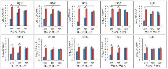 Number of biofilm cells of the 10 STEC isolates after incubation at 22 °C and 13 °C for 24, 48, and 72 h. Asterisk denotes a significant difference (P < 0.05).