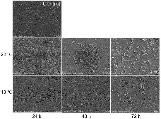 Representative SEM images of O113 biofilm grown in M9 medium at 22 °C and 13 °C for 24, 48, and 72 h on stainless steel coupons. Bar = 20 µm.