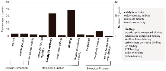 From the AEG set, 10,857 genes were found to be commonly expressed genes in all the four culture conditions (named AEG-C gene set) (Table 2). Of the AEG-C set, 221 (2.04%) genes showed no significant differential expression based on our criteria. Additionally, these are considered “core” genes (CORE) in this species. The average expression of the core genes was 584 FPKM, the lowest expression was 26 FPKM while the highest expression was up to 13,450 FPKM. Of these 221 CORE genes, 108 (48.87%) were functionally annotatable (Table S1). Among these annotatable CORE genes, the most highly expressed gene encodes 14-3-3 protein, and the second encodes adenosine diphosphate (ADP) ribosylation factor. Functions of CORE genes were confirmed by GO annotation. The 84 GO annotatable genes were distributed in two subcategories of cellular component, six subcategories in molecular functions, and three subcategories in biological processes (Figure 1). Two of the sub-categories of molecular functions were highly enriched: Catalytic activity and binding. Included in the catalytic activity subcategory were oxidoreductase, hydrolase, and transferase activities. There were eight types of binding, including organic cyclic and heterocyclic compound binding, protein binding, and ion binding (Figure 1).