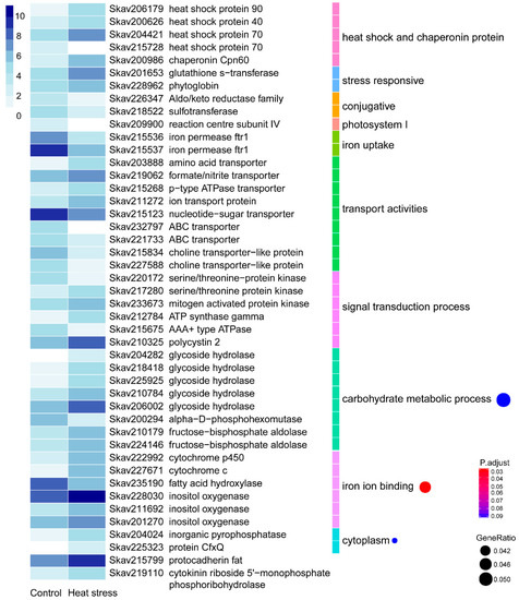 Differential gene expression in response to heat stress (30 °C). The heatmap color strength represents log2-transformed gene expression levels estimated as fragments per kilo-base of exon model per million mapped fragments (FPKM), from dark blue (highest), light blue, to white (lowest). Each color bar on the middle right marks a functional category. Each dot on the right marks a category based on GO enrichment (p-value cutoff = 0.1). The dot size represents the enriched DEGs count. The color strength represents the p-value. Control: SymkaSL2 grown in L1 medium at 25 °C. HS: SymkaSL1 was grown in L1 medium at 30 °C.