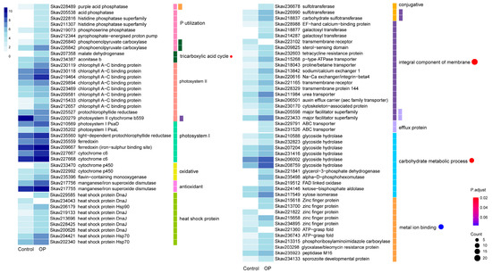 Differential gene expression in response to organophosphate. The heatmap color strength represents log2-transformed gene expression by fragments per kilo-base of exon model per million mapped fragments (FPKM), from dark blue (highest), light blue, to white (lowest). Each color bar on the middle right marks a functional category. Each dot marks a category based on GO enrichment (p-value cutoff = 0.1). The dot size represents the enriched DEGs count. The color strength represents the p-value. Control: SymkaSL2 was grown in L1 at 25 °C. OP: SymkaSL4 was grown in L1 medium with DIP replaced by glycerophosphate at 25 °C.