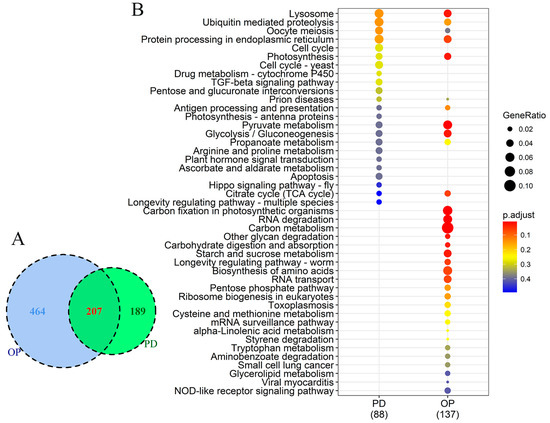 Comparison of differentially expressed genes between P-deprived (PD) and organophosphate (OP) conditions. (A) Venn diagram showing numbers of DEGs common in both or unique to each of the two P conditions. (B) KEGG pathway enrichment; dot size represents enriched DEGs count; color strength represents the p-value (from lowest in red to highest in blue).