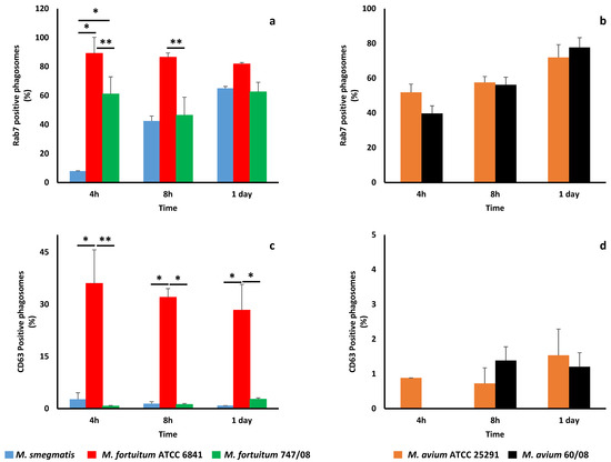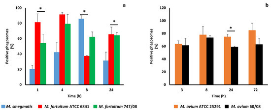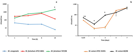 - Anes, E.; Peyron, P.; Staali, L.; Jordao, L.; Gutierrez, M.G.; Kress, H.; Hagedorn, M.; Maridonneau-Parini, I.; Skinner, M.A.; Wildeman, A.G.; et al. Dynamic life and death interactions between Mycobacterium smegmatis and J774 macrophages. Cell. Microbiol. 2006, 8, 939–960. [Google Scholar] [CrossRef] [PubMed]