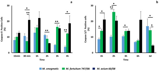- Bhattacharyya, A.; Pathak, S.; Basak, C.; Law, S.; Kundu, M.; Basu, J. Execution of Macrophage Apoptosis by Mycobacterium avium through Apoptosis Signal-regulating Kinase 1/p38 Mitogen-activated Protein Kinase Signaling and Caspase 8 Activation. J. Biol. Chem. 2003, 278, 26517–26525. [Google Scholar] [CrossRef] [PubMed]