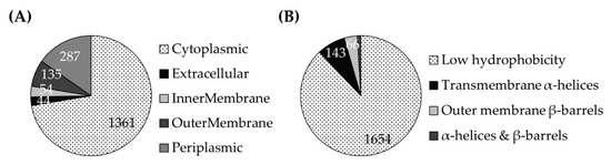 A comprehensive study investigated the rumen microbiome and quantified a total of 8163 bacterial proteins in three distinct rumen fractions of three individual cows that were fed rotationally with varying diets [17] which revealed that a major part of 1881 proteins belonged to the family of Prevotellaceae of which 49 proteins were assigned to P. bryantii B14 (Table S1). About 72% of the Prevotellaceae-derived proteins were predicted to be cytoplasmic proteins, above 15% belonged to the periplasmic space, and 10% were assigned to inner and outer membrane proteins (Figure 1A and Table S1) which emphasized the capability of mass spectrometry-based analyses to identify subunits of membrane-associated proteins [38]. A total of above 12% of the respective protein sequences were predicted to contain hydrophobic stretches that were assigned to membrane-bound α-helices and β-barrels (Figure 1B and Table S1).
