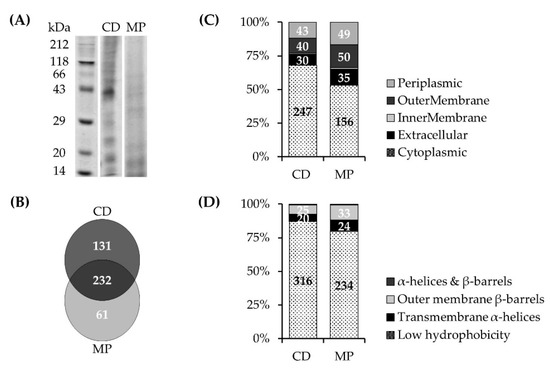 (A) Separation of proteins from subcellular fractions (MP, membrane proteins; CD, cell debris) of the P. bryantii B14 proteome by sodium dodecyl sulfate polyacrylamide gel electrophoresis (SDS-PAGE). (B) Overlap of proteins identified in the MP fraction (293 proteins) and CD fraction (363 proteins). (C) Predicted subcellular localization of proteins (Cello). Cytoplasmic proteins detected in the MP fraction represent contaminations which were not completely removed during preparation of the MP fraction. (D) Membrane-affiliated motifs: α-helices and β-barrels of proteins identified in the MP and CD fractions (TMHMM Server v. 2.0 and PRED-TMBB2).