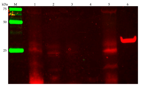 - Laemmli, U.K. Cleavage of structural proteins during the assembly of the head of bacteriophage T4. Nature 1970, 227, 680–685. [Google Scholar] [CrossRef] [PubMed]