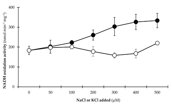 Stimulation of NADH:quinone oxidoreduction activity of P. bryantii B14 membranes by Na+. The assay mixture contained membranes (aliquots of 50 µg protein), 20 mM Tris-HCl (pH 7.5), 100 µM NADH, and 100 µM ubiquinone-1. To the assay mixture, 0–500 µM NaCl (●) or KCl (○) were added. The residual Na+ concentration in every samples was 40 µM. The oxidation of NADH was followed spectrophotometrically at 25 °C. Mean values and SD are from n = 3 measurements.