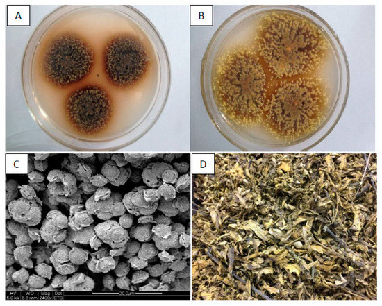Morphological characteristics of Eurotium amstelodami BSX001 isolated from Fu brick tea. (A) Colonies grown on the CZA agar at 28 °C for ten days. (B) Colonies grown on the CZA20 agar at 28 °C for ten days. (C) SEM image of gold-sputtered samples of ascospores (incubated for two weeks), scale bar = 20 µm. (D) Hippophae rhamnoides leaves (HRL) with “golden flowers” visible to the naked eye.