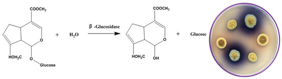 In nature, there are many fungi that can produce β-glucosidase to degrade geniposide. However, such microbial resources can be well exploited when an appropriate medium is designed or employed [35,36]. Using geniposide as a sole carbon source in the modified Czapek–Dox medium, we managed to screen a wild-type fungus that produces β-glucosidase to catalyze the hydrolysis reaction of geniposide to genipin (Figure 3). After the hydrolysis of geniposide by β-glucosidase, the generated genipin reacted with glutamate to form a blue transparent circle (Figure 3). This strain was identified as E. amstelodami BSX001 and preserved by the Agricultural Culture Collection of China (ACCC) under a collection number ACCC32729.