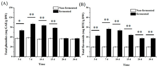 Contents of the total phenolic compounds (A) and flavonoids (B) in non-fermented and fermented HRLs by E. amstelodami BSX001. Note: ** extremely significant difference (p < 0.01) and * significant difference (p < 0.05).